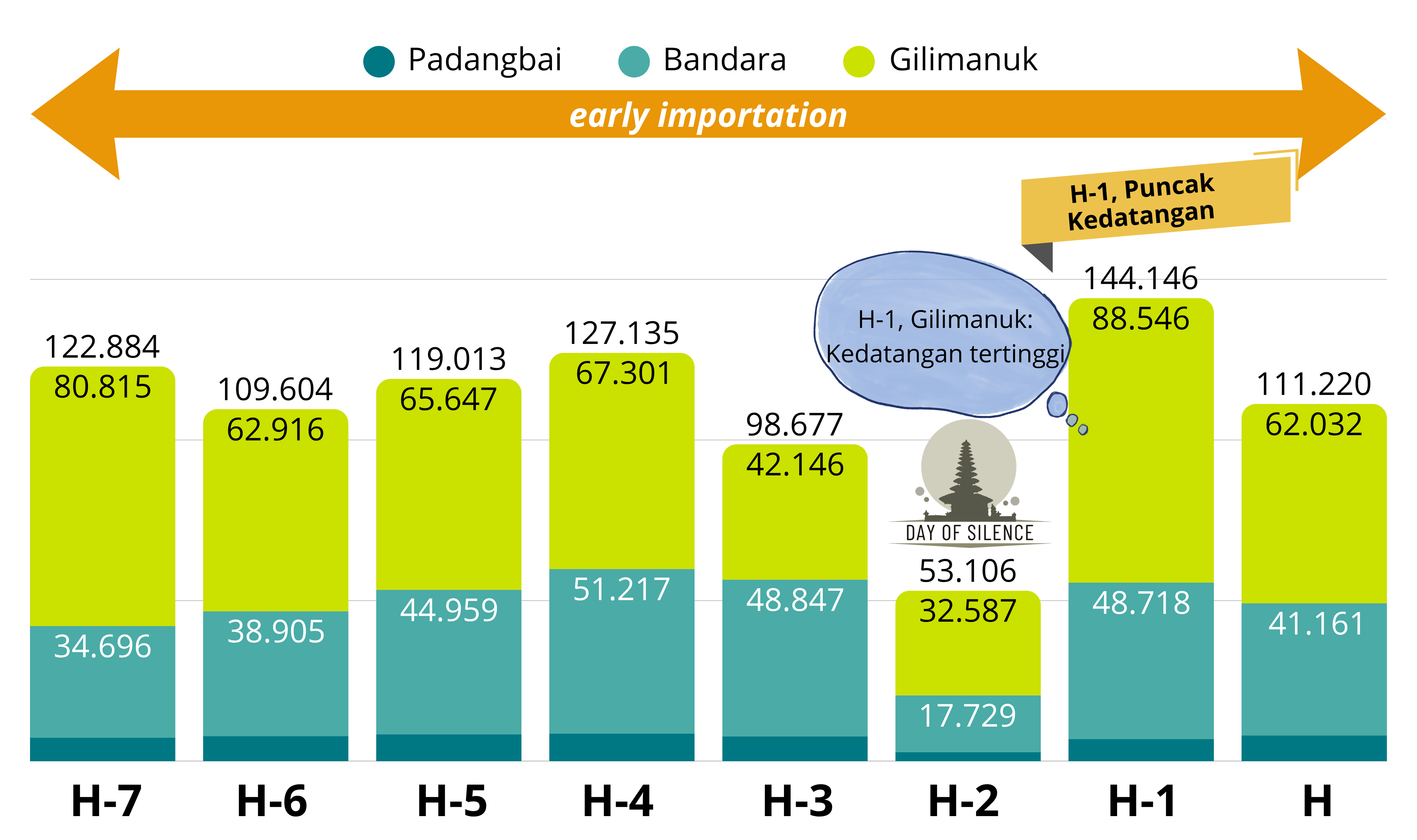 Namun, fase pra-Lebaran (H-5 hingga H-1) juga ditandai oleh peningkatan arus masuk ke Bali yang didominasi oleh wisatawan domestik serta mobilitas antarwilayah Jawa–Bali–Lombok. Pergerakan ini umumnya bersifat non-mudik (leisure) dan menunjukkan pola kedatangan lebih awal untuk menghindari kepadatan puncak nasional. Pola peningkatan kedatangan tersebut dapat terlihat pada distribusi pelaku perjalanan selama periode pra-Lebaran berikut: