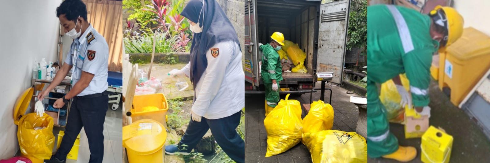 Pemilahan limbah oleh petugas menggunakan alat pelindung diri untuk menghindari risiko infeksi atau cedera.
